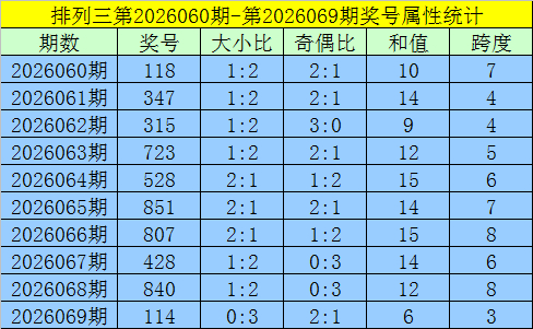 上期转头:胪列三第2026069期出现奖号114。开出组三,奇偶比2:1,012路比0:3:0,大小比0:3,和值6,跨度3。