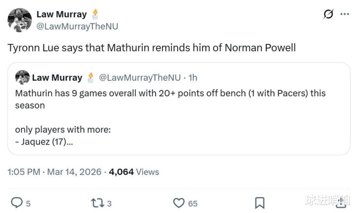 赛后泰伦卢涓滴不诡秘对他的好奇,公开推奖到:“他让我思起了诺曼-鲍威尔。”