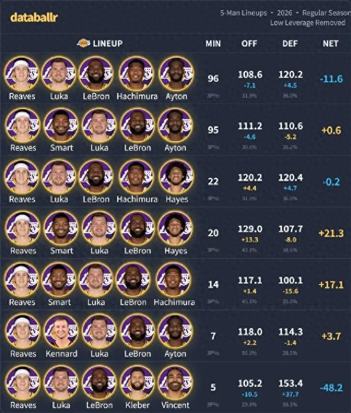 四套声势净胜分沿途打破 + 17,东契奇、里夫斯、斯玛特铁三角搭配海斯 / 八村塁 / 艾顿,胜率 83.3%!詹姆斯缺席时湖东谈主攻防炸裂,难谈这支湖东谈主莫得老詹才是真阵势?