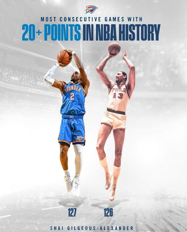 另外,今天亚历山大创下了历史性时分——流畅127场拿到20+,径直破裂上古神兽张伯伦尘封63年的126场记录,登顶NBA历史第一!