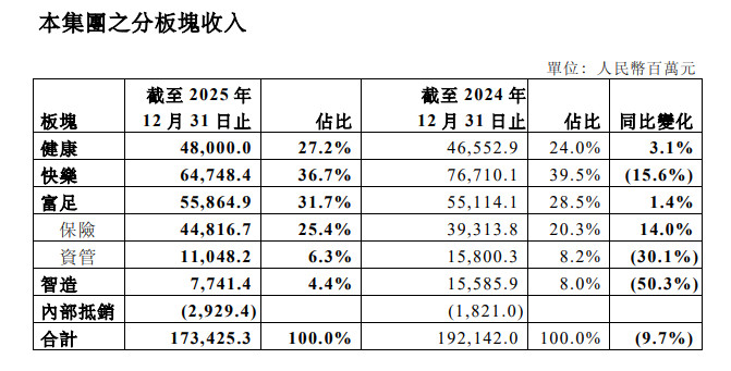 复星国际的主要业务分为健康、安祥、饶沃、智造四大板块,澳门大阳城官网涵盖四大中枢企业——复星医药、豫园股份、复星葡萄牙保障和复星旅文。2025年,四大中枢企业总收入达到1282.4亿元,占总收入比重达到74%,剔除豫园股份影响,收入同比飞腾3%。