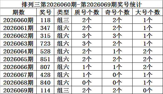 上期回来:罗列三第2026069期开奖:114,质合比为2:1,奇偶比为0:3,大小比为2:1。
