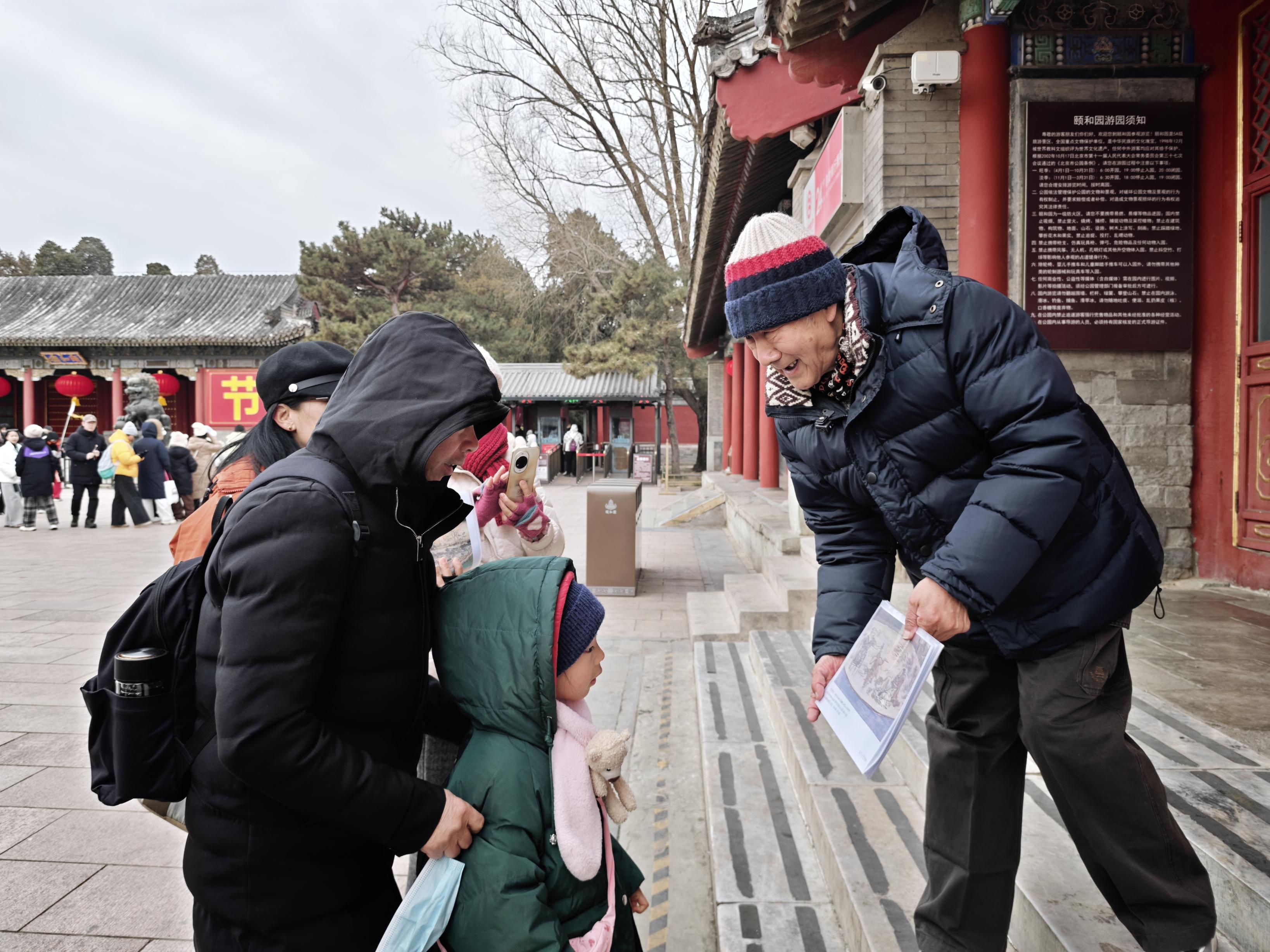 马年新春,颐和园里游东谈主如织。一位精神执意的老东谈主站在长廊下,声息洪亮地讲授着彩画上的“千军万马”,蛊惑了不少旅客安身凝听。