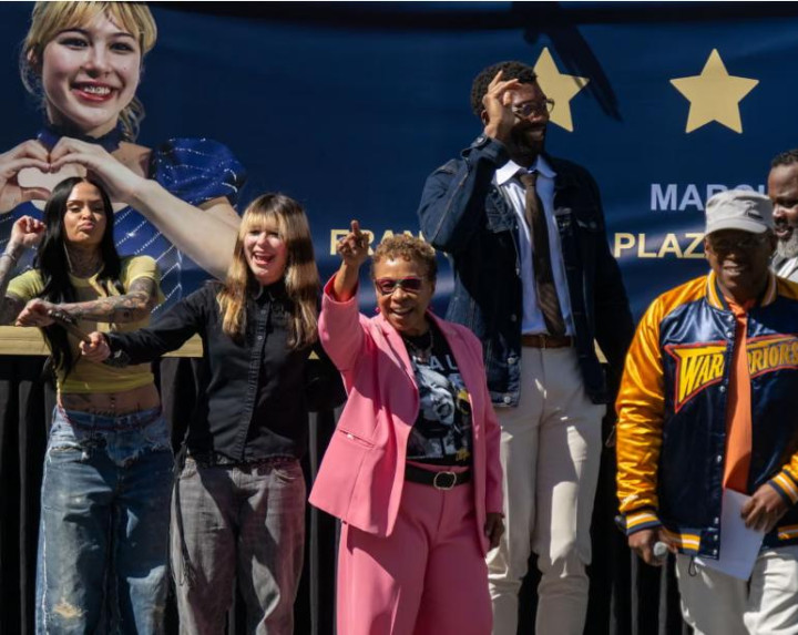 从左到右:两届格莱好意思奖得主Kehlani,刘好意思贤,奥莱多市长芭芭拉·李,嘻哈教父Sway众星捧月