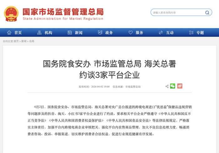 据国度阛阓监管总局网站音问,4月2日,国务院食安办、阛阓监管总局、海关总署对央广总台报谈的跨境电商入口“优念念益”保健品违章营销等问题波及的抖音、淘天、小红书3家平台企业进行了约谈。