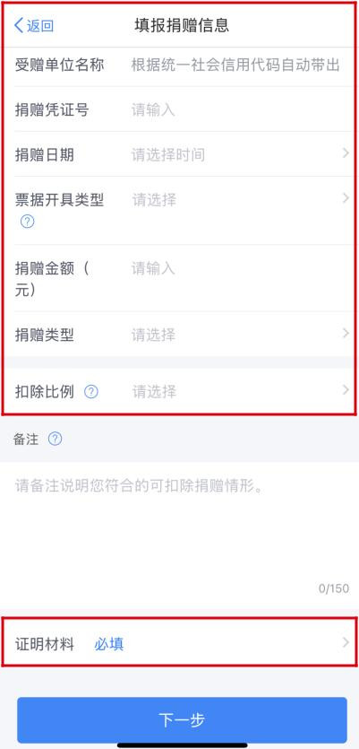 二、根据本色情况,确乎填写【填报捐赠信息】并点击【下一步】;