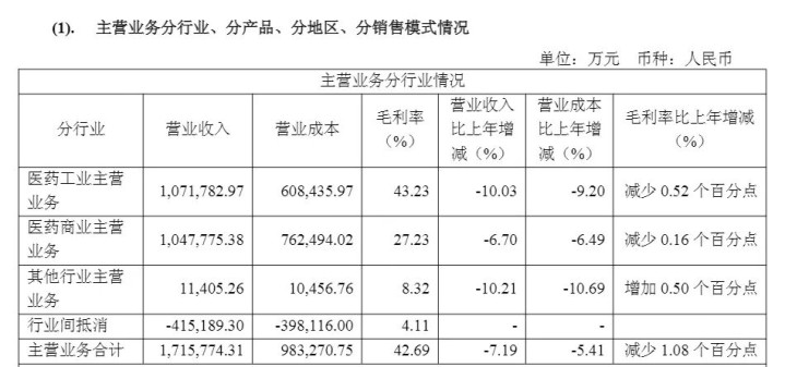 分行业看,医药工业主营业务营业收入107.18亿元,同比下落10.03%;医药贸易主营业务营业收入104.78亿元,ued中国官网同比下落6.70%;其他行业主营业务营业收入1.14亿元,同比下落10.21%;行业间对消营收41.52亿元。