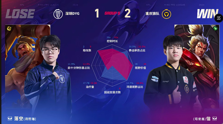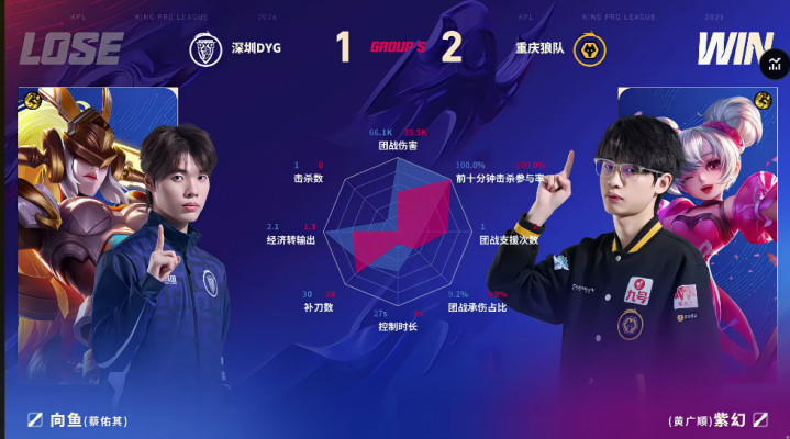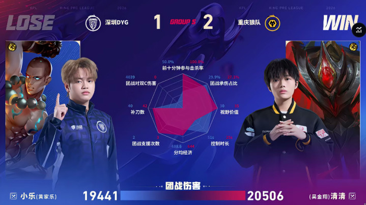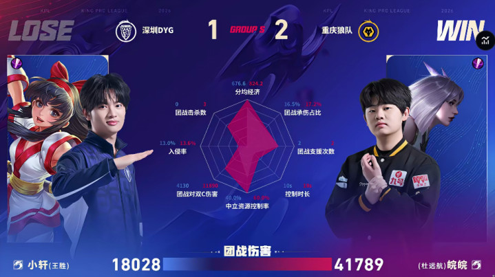 SuncityGroup 狼队/DYG第二局数据对比: 小乐曹操输出伤害高达两万八