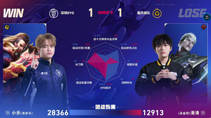 SuncityGroup 狼队/DYG第二局数据对比: 小乐曹操输出伤害高达两万八