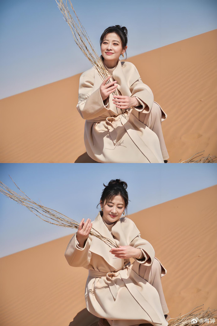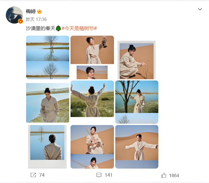 春天一到,万物齐随着醒了。3月12日植树节这天,梅婷在酬酢平台发布了一条动态,配文只消五个字:“沙漠里的春天”。
