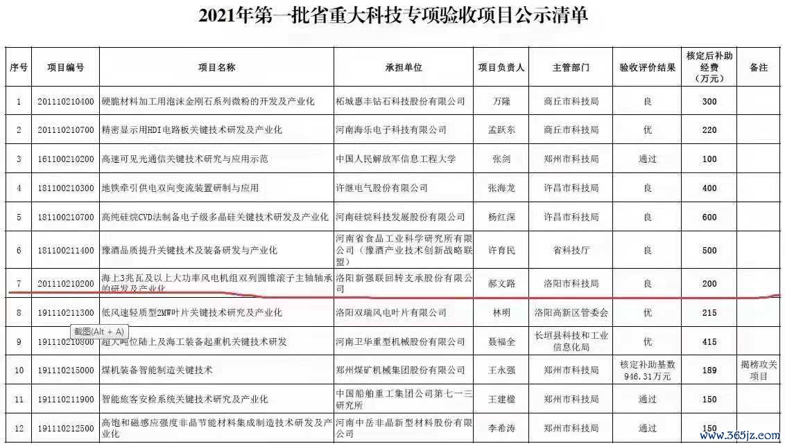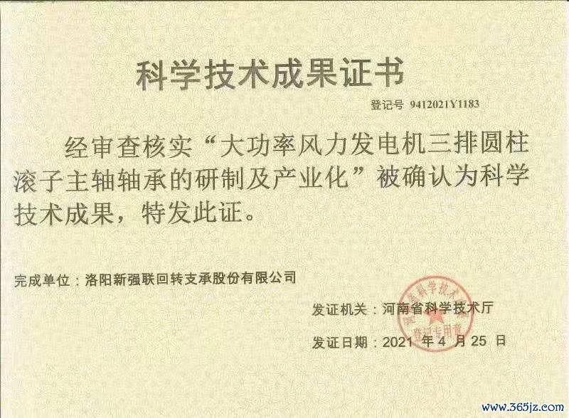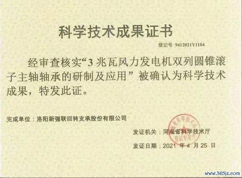 公司3兆瓦风力发电机双列圆锥滚子主轴轴承的研制及应用和大功率风力发电机三排圆柱滚子主轴轴承的研制及产业化被河南省科学技术厅确认为科学技术成果。