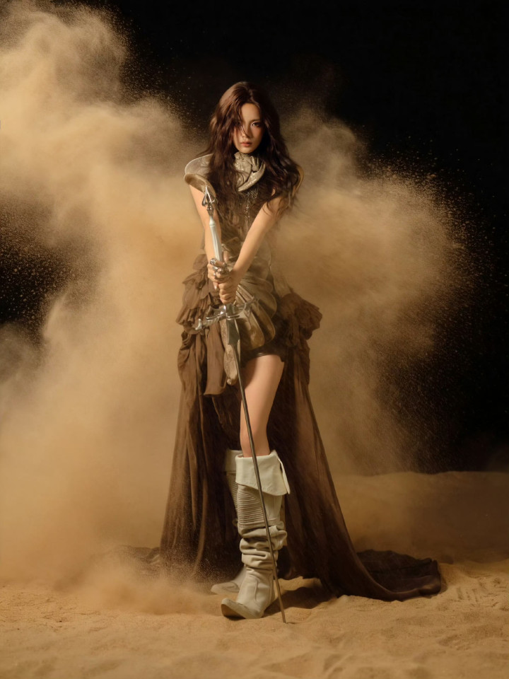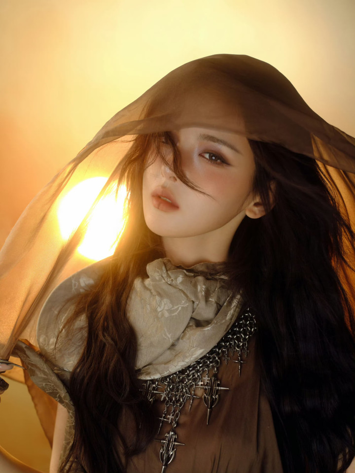 暖调沙雾光影里,她长发跟着头纱扬起,冰寒眉眼间尽是故事感,将野性与灵动无缺会通,把废土风的渺茫与力量感演绎得大书特书,突破了甜妹标签,尽显大女主气场。