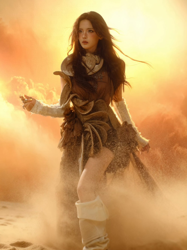 杨寥落踏进漫天黄沙的荒废场景,孤单作念旧感的棕褐废土风穿搭,层叠褶皱的裙摆、绑带缠绵与作念旧配饰,打造出凌厉飒爽的沙漠女战士既视感。
